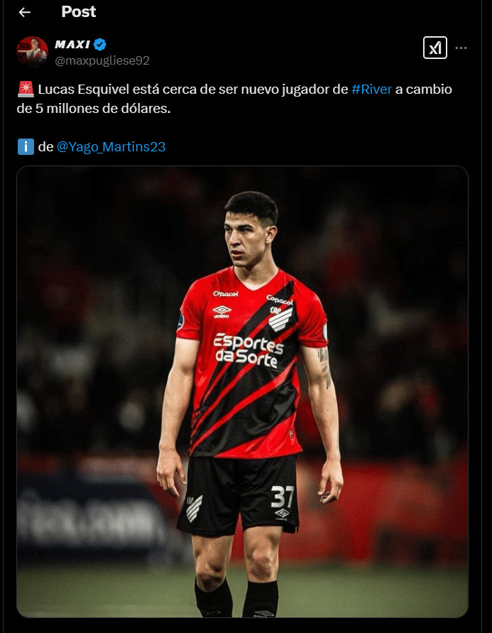 Finalmente, luego de semanas de charlas y negociaciones, todo se concretó. Porque según reveló el periodista Yago Martins desde Brasil: “Esquivel está cerca de ser nuevo jugador de River a cambio de 5 millones de dólares”. Restan horas para cerrar oficialmente a un nombre que tanto pidió Gallardo de cara a una nueva temporada que ya arrancó.