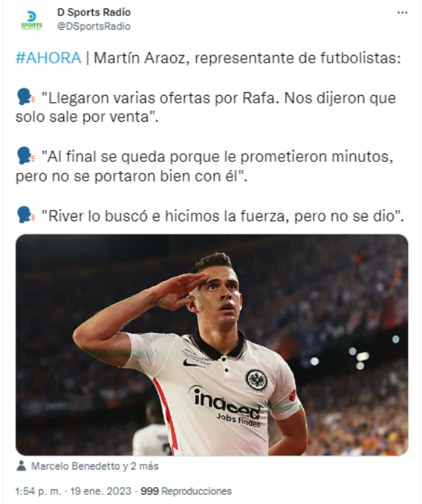 En conclusión, más allá de todas las idas y vueltas y los sondeos que siguen llegando tanto desde Europa como de Brasil, Rafa tendrá otra oportunidad en Alemania. Aunque todavÃa no se olvida del difÃcil 2022 que atravesó. “No se portaron bien con él“, declaró MartÃn Araoz en diálogo con D Sports Radio, manifestando la molestia del colombiano. Ahora bien, habrá que ver qué le depara este año y si efectivamente Frankfurt cumple la promesa de darle rodaje. ¿Qué opinás?