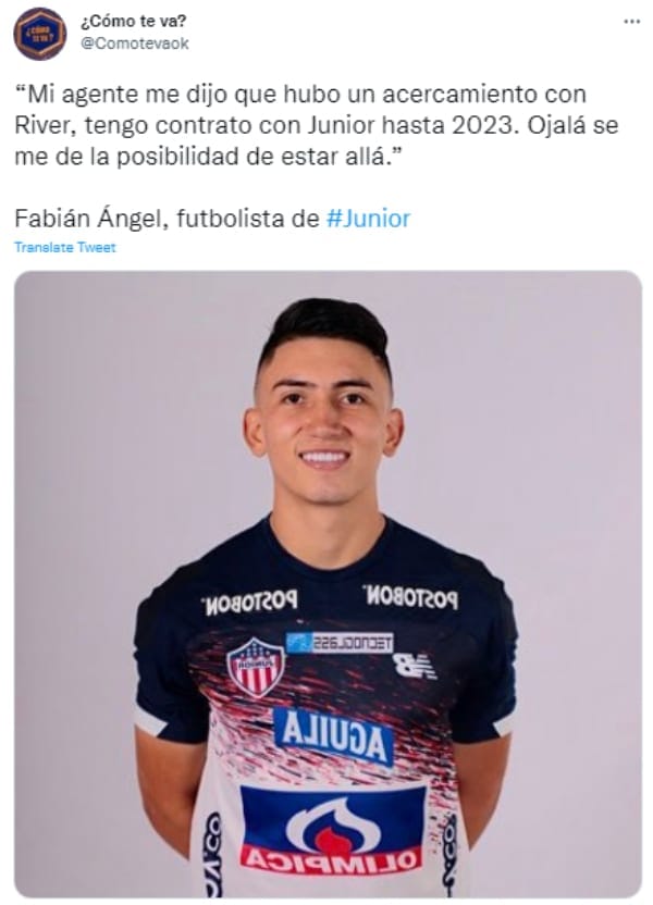 La semana pasada salió a la luz el interés del Muñeco por Fabián Ángel, volante Junior de Barranquilla, y una de las grandes promesas del fútbol colombiano. Con sus cortos 20 años, y su grandes cualidades técnicas, cautivó a Gallardo. Y rompió el silencio hace horas. “Me encantaría ir a River, es un club de los más grandes de Sudamérica“, comenzó en diálogo con ¿Cómo Te Va? por Radio Colonia.