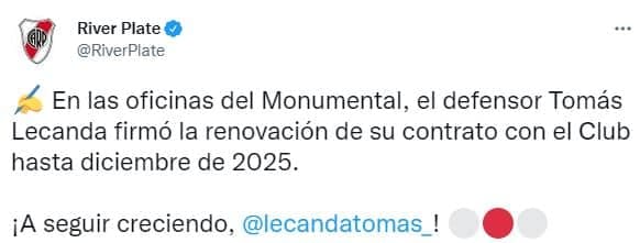 Tomás Lecanda, defensor central de la reserva, finalizaba su vÃnculo el próximo 30 de junio. Desde la dirigencia de River se movieron rápido para evitar que quedara libre y le extendieron el contrato. De todos los jugadores del Millonario que integran el plantel de reserva, el que más experiencia ostenta es Tomás Lecanda, a pesar de solo tener 19 años. Gallardo ya lo supo utilizar cuando el equipo lo necesito.