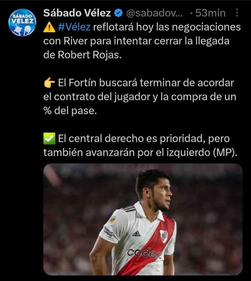 El medio Sábado Vélez informó en su cuenta de Twitter que la idea es tratar de cerrar el pase en las próximas horas. “Vélez reflotará hoy las negociaciones con River para intentar cerrar la llegada de Robert Rojas. El Fortín buscará terminar de acordar el contrato del jugador y la compra de un porcentaje del pase”, reveló.
