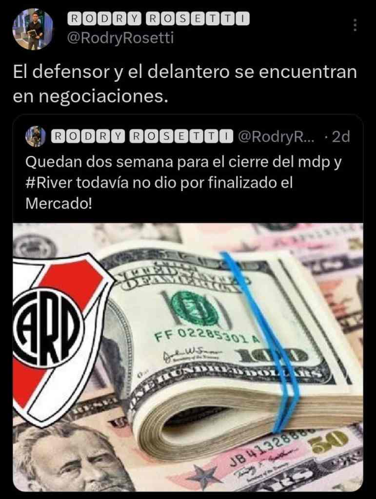 Es por esta razón que hora lo que pretende River es poder reforzar tanto la delantera como la última línea y parece que desde hace varios días el Millonario se encuentra negociando en silencio para concretar la llegada de dos nuevos futbolistas. Así lo expresó Rodrigo Rosetti en su cuenta de Twitter, asegurando que hay negociaciones.
