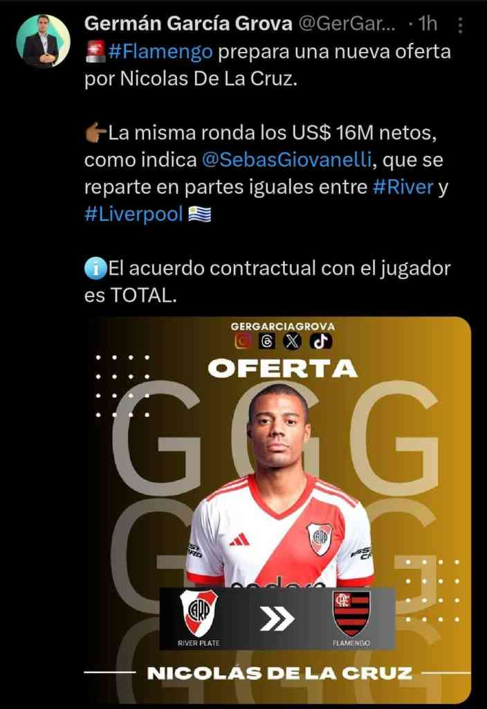 “Flamengo prepara una nueva oferta por Nicolás De La Cruz. La misma ronda los 16 millones de dólares netos, que se reparte en partes iguales entre River y Liverpool de Uruguay”, explicó Germán García Grova en su cuenta de Twitter. Sin embargo una de las partes más importantes tiene que ver con el acuerdo al que llegó el charrúa con el Mengao.