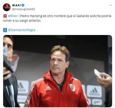 Por otro lado, Marcelo Gallardo en una sus reuniones con Jorge Brito dejó en claro que necesita realizar ciertas incorporaciones para comenzar a trabajar en esta vuelta a River. Uno de los pedidos fue que se produzca la llegada de alguien muy especial. “Pedro Hansing es otro nombre que si el Muñeco solicita podrÃa volver a su cargo“, manifestó Damian Villagra.