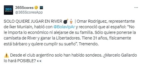 Solo quiere ponerse la camiseta de River y ganar la Copa Libertadores. Tiene 31, físicamente está bárbaro y quiere cumplir su sueño“, agregó. Además, se conoció que Iker Muniain rechaza todas las ofertas formales que recibe porque su intención es jugar en el fútbol argentino. Está a la espera de que lo llamen desde el Estadio Monumental y negocien su salario.