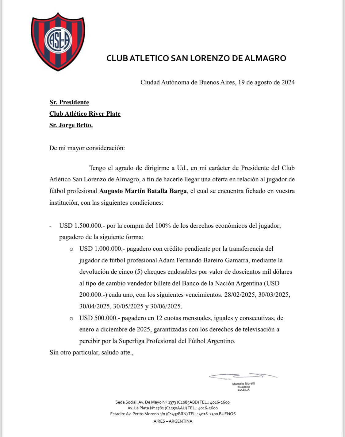 El mercado de pases en la mañana de este jueves expuso que San Lorenzo difundió un documento sobre la propuesta formal de compra de Augusto Batalla. En el mismo, se puede apreciar el dinero que River iba a recibir y la forma de cobro. No obstante, la oferta presenta una serie de errores y detalles que son muy particulares.