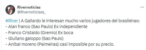 A falta de semanas para que el mercado de pases comience, los trascendidos señalan que se darÃa una novela entre River y Boca. Esto se debe a los intereses que Marcelo Gallardo y Fernando Gago tienen sobre un volante que se encuentra sumando minutos en Brasil. Uno que podrÃa marcar la diferencia en cancha.