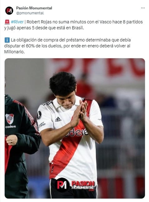 Sin embargo, eso no es lo único porque de Brasil llega una noticia bastante particular. “Robert Rojas no suma minutos con el Vasco hace 8 partidos y jugó apenas 5 de que está en Brasil“, señalaron desde Pasión Monumental. “La obligación de compra del préstamo determinaba que debía disputar el 60% de los duelos, por ende en enero deberá volver al Millonario“, agregaron.