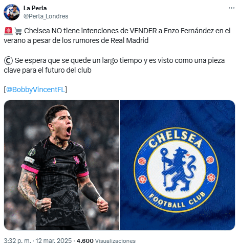 Sin embargo, este escenario se diluyó en un abrir y cerrar de ojos, tal como salió a la luz hace unas horas. “Chelsea NO tiene intenciones de VENDER a Enzo Fernández en el verano a pesar de los rumores de Real Madrid. Se espera que se quede un largo tiempo y es visto como una pieza clave para el futuro del club”, aseguró el comunicador Bobby Vincent.