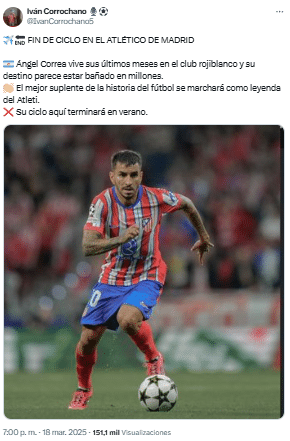 “FIN DE CICLO EN EL ATLÉTICO DE MADRID. Ángel Correa vive sus últimos meses en el club rojiblanco y su destino parece estar bañado en millones. El mejor suplente de la historia del fútbol se marchará como leyenda del Atleti. Su ciclo aquí terminará en verano“, confirmó Iván Corrochano, anticipando un nuevo e inesperado giro en la carrera del delantero.