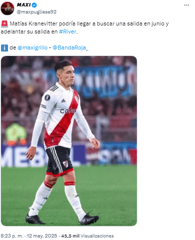 “Matías Kranevitter podría adelantar su salida de River en junio“, comentó Maximiliano Grillo hace unas horas, anticipando el cierre de un ciclo que estaba previsto que termine en diciembre. Cabe recordar que el Colo quedará con el pase en su poder a fin de año y, hasta el momento, no se conocen novedades sobre su posible renovación. ¿Se va dentro de un mes?