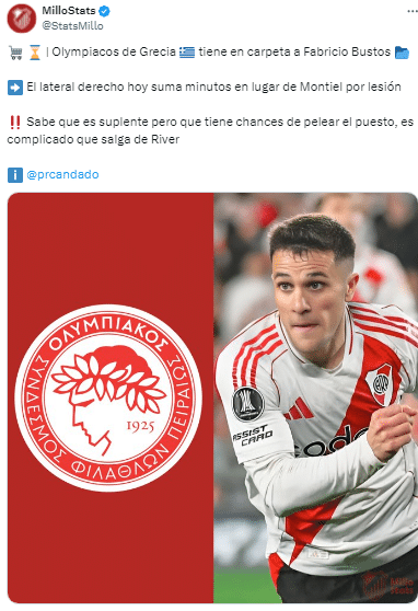 Olimpiacos de Grecia tiene EN CARPETA a Fabricio Bustos. El lateral suma minutos en lugar de Montiel por lesión. Sabe que es suplente, pero tiene chances de pelear por el puesto. Es complicado que salga de River“, confirmaron desde Pasión Riverplatense, anticipando un nuevo dolor de cabeza para el Muñeco en vistas del próximo mercado.