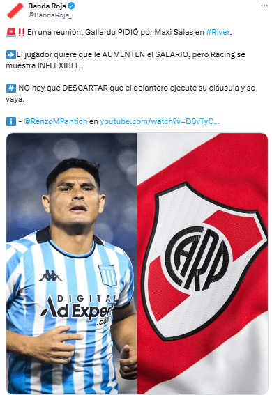 Con este escenario, apareció el nombre de Maximiliano Salas sobre la mesa, quien siempre fue de su gusto y parecía debatirse entre continuar en Racing o poner en marcha un nuevo desafío. “En una reunión, Marcelo Gallardo pidió por la llegada de Maxi Salas a River. El jugador quiere que le aumenten el salario, pero Racing se muestra inflexible”, confirmó Renzo Pantich.