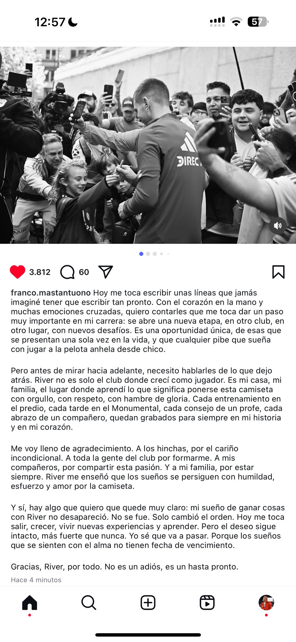 “Pero antes de mirar hacia adelante, necesito hablarles de lo que dejo atrás. River no es solo el club donde crecà como jugador. Es mi casa, mi familia, el lugar donde aprendà lo que significa ponerse esta camiseta con orgullo, con respeto, con hambre de gloria. Cada entrenamiento en el predio, cada tarde en el Monumental, cada consejo de un profe, cada abrazo de un compañero, quedarán grabados para siempre en mi historia y en mi corazón”, agregó.