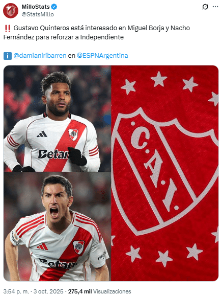 En esta lÃnea, Damián Iribarren también anticipó un intento del conjunto de Avellaneda por Miguel Borja, quien parece tener un pie y medio afuera del Millonario y tampoco renovarÃa su contrato. Por lo pronto, no existen noticias positivas que inviten a pensar en su continuidad, por lo que la posibilidad que acerca a Independiente comienza a ganar fuerza con el correr de los dÃas.