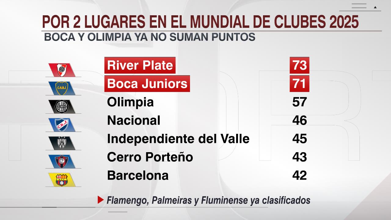 Es importante recordar que los puntos en el ranking solo se pueden conseguir por afrontar partidos en la máxima competencia internacional. Esto genera que River haya superado a Boca. Debido a que este último al participar de la Copa Sudamericana se quedará estancado en 71 unidades. Y corre el riesgo de ser alcanzado por Olimpia, Nacional, Independiente del Valle y Cerro Porteño.