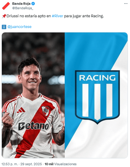 “Sebastián Driussi no estarÃa apto en River para jugar contra Racing“, aseguró Juan Cortese en las últimas horas. El delantero sigue sin estar al cien desde lo fÃsico después del desgarro en el bÃceps femoral izquierdo, que también lo dejó afuera de la revancha contra Palmeiras. Por lo tanto, Gallardo tendrá que volver a elegir entre Facundo Colidio o Miguel Borja para acompañar a Maxi Salas.