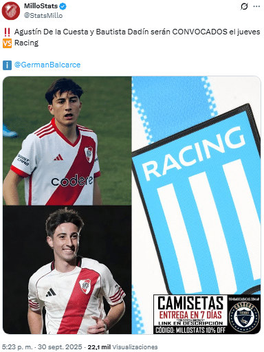 Aunque correr por detrás de sus competidores, tanto Bautista Dadín como Agustín de la Cuesta se ilusionan con sumar minutos contra Racing. Comenzarían desde el banco de suplentes, no obstante, podría saltar al verde césped en el complemento. Franco Armani; Gonzalo Montiel, Lucas Martínez Quarta, Lautaro Rivero, Marcos Acuña; Juan Portillo, Giuliano Galoppo, Juanfer Quintero, Kevin Castaño o Santiago Lencina; Maximiliano Salas y Facundo Colidio.