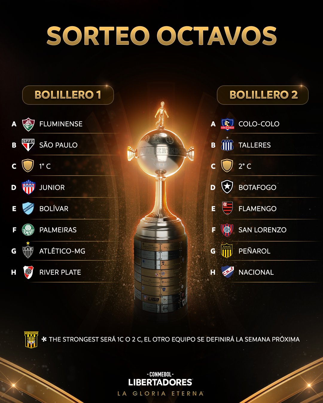 Por otro lado, el bolillero de los segundos expone las clasificaciones de Colo Colo, Talleres de Córdoba, Botafogo, Flamengo, San Lorenzo, Peñarol y Nacional. Este último compartió zona con River, pero al tratarse de una nueva instancia no se lo debe descartar como posible adversario. También están habilitados a duelos entre equipos del mismo país.