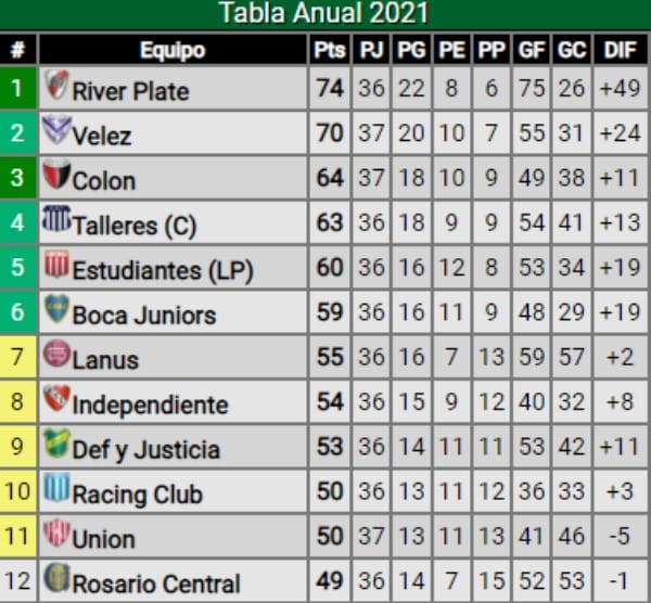 Concretamente, River se aseguró el primer lugar en la tabla anual, lo que lo convierte en el mejor equipo del 2021 en la Argentina. Sus 74 puntos ya son inalcanzables para Vélez, que tan solo tiene tres unidades por disputar. Además, al Millonario aún le quedan dos partidos por delante, ante Defensa y Justicia mañana, y contra Atlético Tucumán.