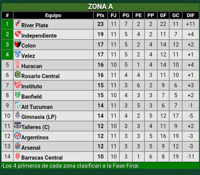 Independiente no pudo ganarle a Arsenal y empató sin goles en Avellaneda. En consecuencia, la tabla quedó la siguiente manera: River es el único puntero con 23 unidades. Mientras que el Rojo está segundo con 19, Colón de Santa Fe y Vélez serían los otros clasificados con 17 unidades. Aunque Huracán, Rosario Central, Instituto y Banfield también tienen chances de avanzar de ronda.