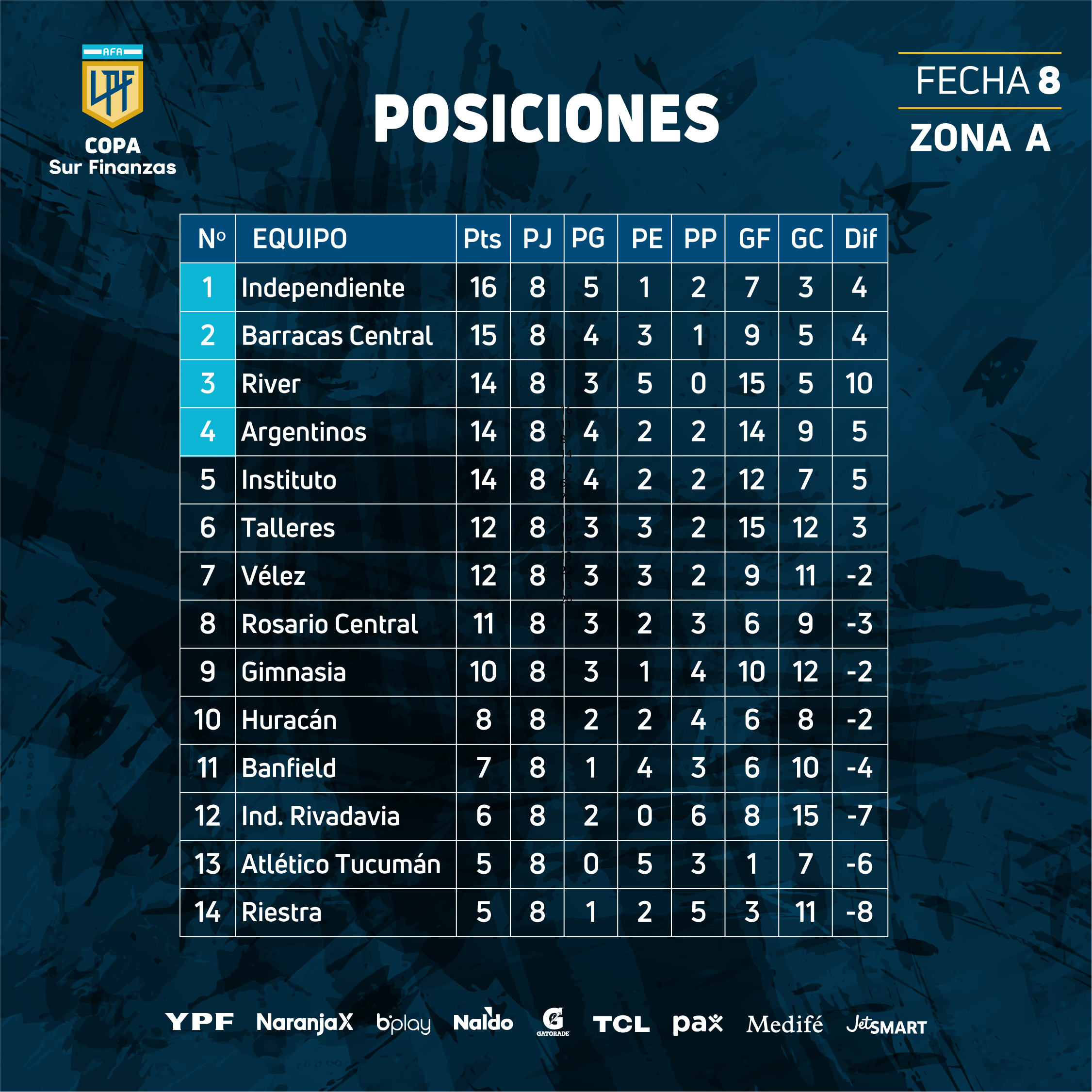 Hasta el momento, la Zona A de la Copa de la Liga presenta a Independiente, Barracas Central, River y Argentinos Juniors como candidatos a avanzar a los cuartos de final. Aunque es importante destacar que todavía quedan 18 puntos en juego, y la diferencia con los clubes no clasificados es de tan solo una unidad. Por lo tanto, en seis fechas puede pasar de todo.
