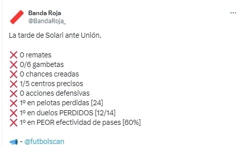 Tras el pitazo final de Pablo EchevarrÃa, las estadÃsticas del partido entre River y Unión se encontraron disponibles para los hinchas. Esto permitió que surja una bastante particular. A razón de que Pablo Solari no logró remates, gambetas, chances creadas, acciones defensivas, fue el primero en perder balones, en duelos y en nula efectividad de pases.