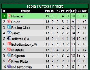Con el empate ante Unión, River se ubica noveno con 14 puntos, pero manera momentánea porque restan partidos por disputarse. Su puntaje es producto de cuatro victorias, dos igualdades y tres derrotas. Por otro lado, Huracán se encuentra en el primer puesto con 19 unidades recolectadas. Las cuales son gracias a cinco triunfos y cuatro empates. Es el único equipo del certamen que no conoció la derrota.