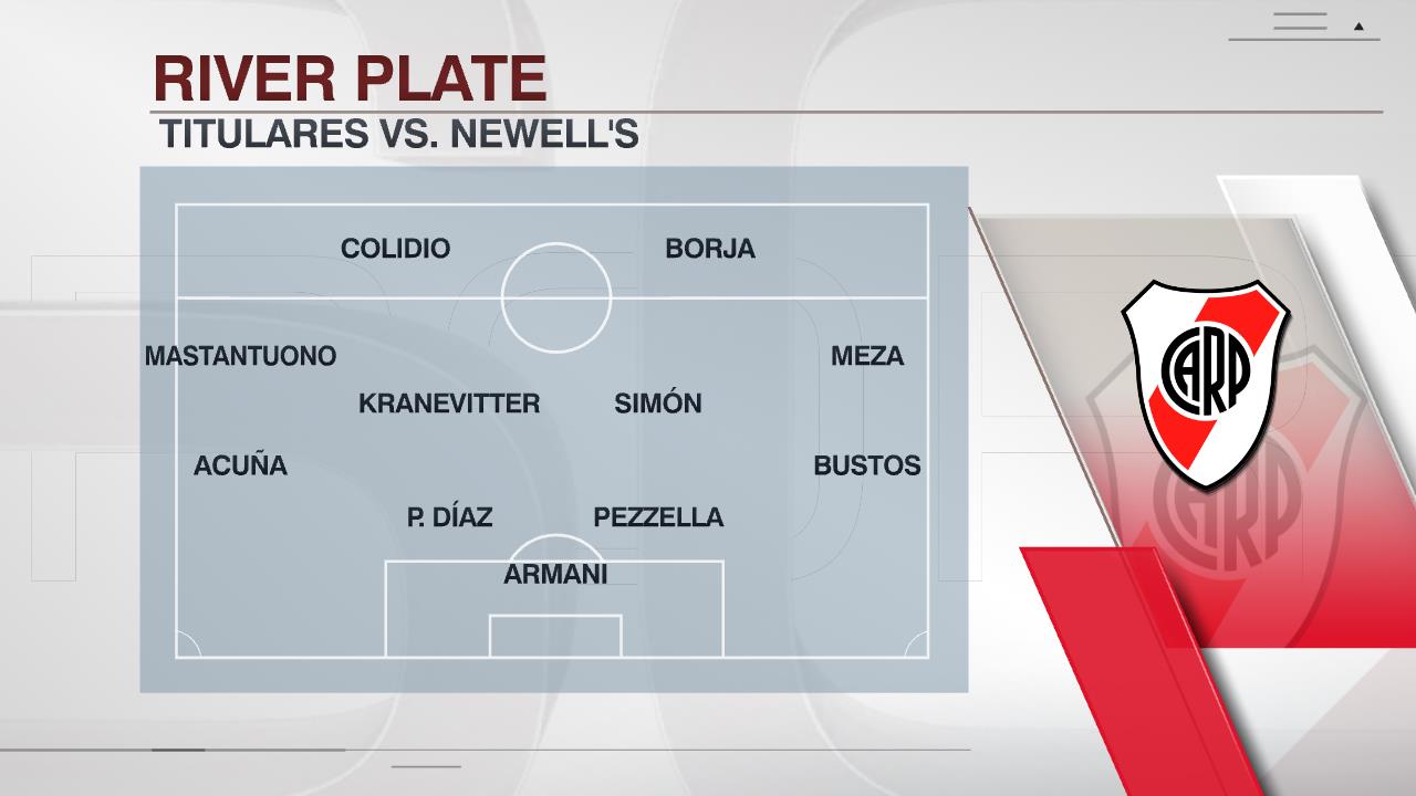 El once de River que Marcelo Gallardo presentó ante Newell’s marca un cambio en la defensa y en el ataque. Ya que a la cancha van a salir Franco Armani; Fabricio Bustos, Germán Pezzella, Paulo DÃaz, Marcos Acuña; MatÃas Kranevitter, Santiago Simón, Maxi Meza, Franco Mastantuono; Facundo Colidio y Miguel Borja. La ausencia de Rodrigo Aliendro permite un delantero más.