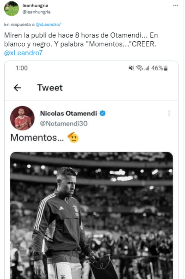 Ahora bien, el defensor de la Selección Argentina todavÃa no respondió, y a pocos dÃas del comienzo del Mundial ese no es un detalle menor. A su vez, en las últimas horas realizó un llamativo posteo en sus redes, y en Portugal empezaron a preguntarse qué será de su futuro. En el mismo se lo ve saliendo a jugar con la camiseta de Benfica por Champions, pero lo curioso es el filtro blanco y negro que usó.