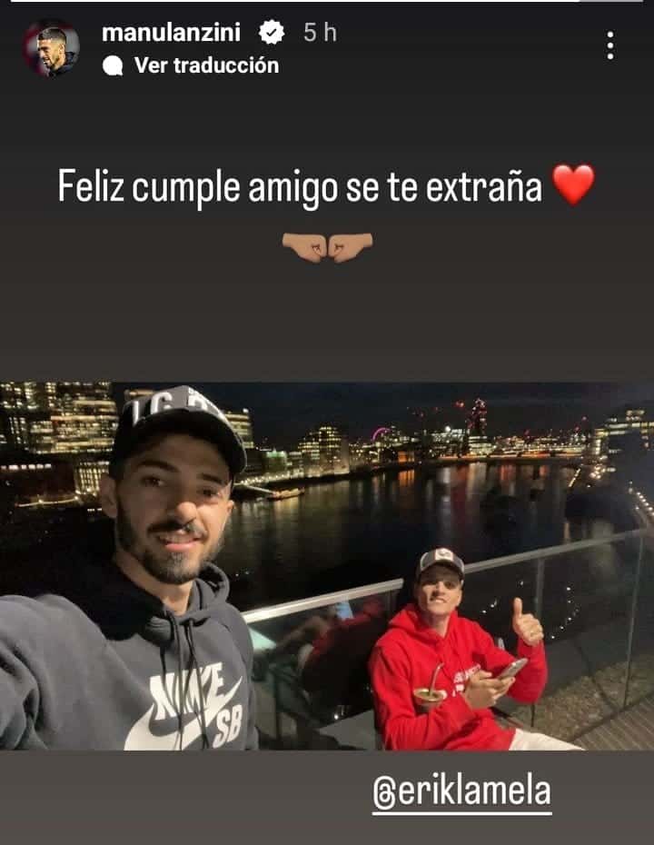 El zurdo pudo celebrar su cumpleaños número 32 y recibió mensajes de todo tipo, pero el de Lanzini llamó poderosamente la atención. El 10 de River subió una foto donde se lo puede ver junto con Coco paseando juntos, con un mensaje bastante nostálgico. “Feliz cumple amigo se te extraña”, escribió Manu acompañado por emojis de corazones y puños chocando.