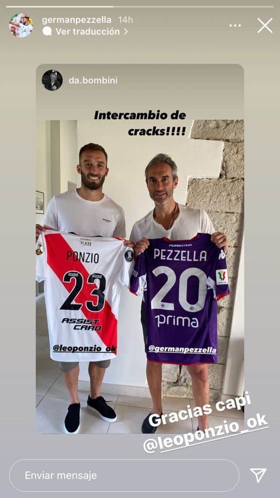Sin su presencia, obviamente por cuestiones de Covid y de que la temporada está vigente, no pudieron hacerlo personalmente. A través del representante, Darío Bombini, Leo Ponzio le envío su camiseta a Germán Pezzella, hoy capitán de la Fiorentina de Italia. River se convirtió y este tipo de gestos se vuelven habituales entre actuales y ex jugadores del club.