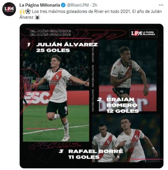 Si hablamos de goleadores, es imposible no detenerse en un nombre propio: Julián Álvarez. El delantero de 21 años tuvo su consagración en 2021 y se despachó con 25 tantos durante el año. Además, dio 16 asistencias. El desglose es el siguiente: 18 goles y 7 asistencias en la Liga Profesional; 2 goles y 1 asistencia en el Trofeo de Campeones; 2 goles y 1 asistencia en la Copa Libertadores; 1 gol y 1 asistencia en la Supercopa Argentina; 2 goles y 6 asistencias en la Copa de la Liga Profesional.